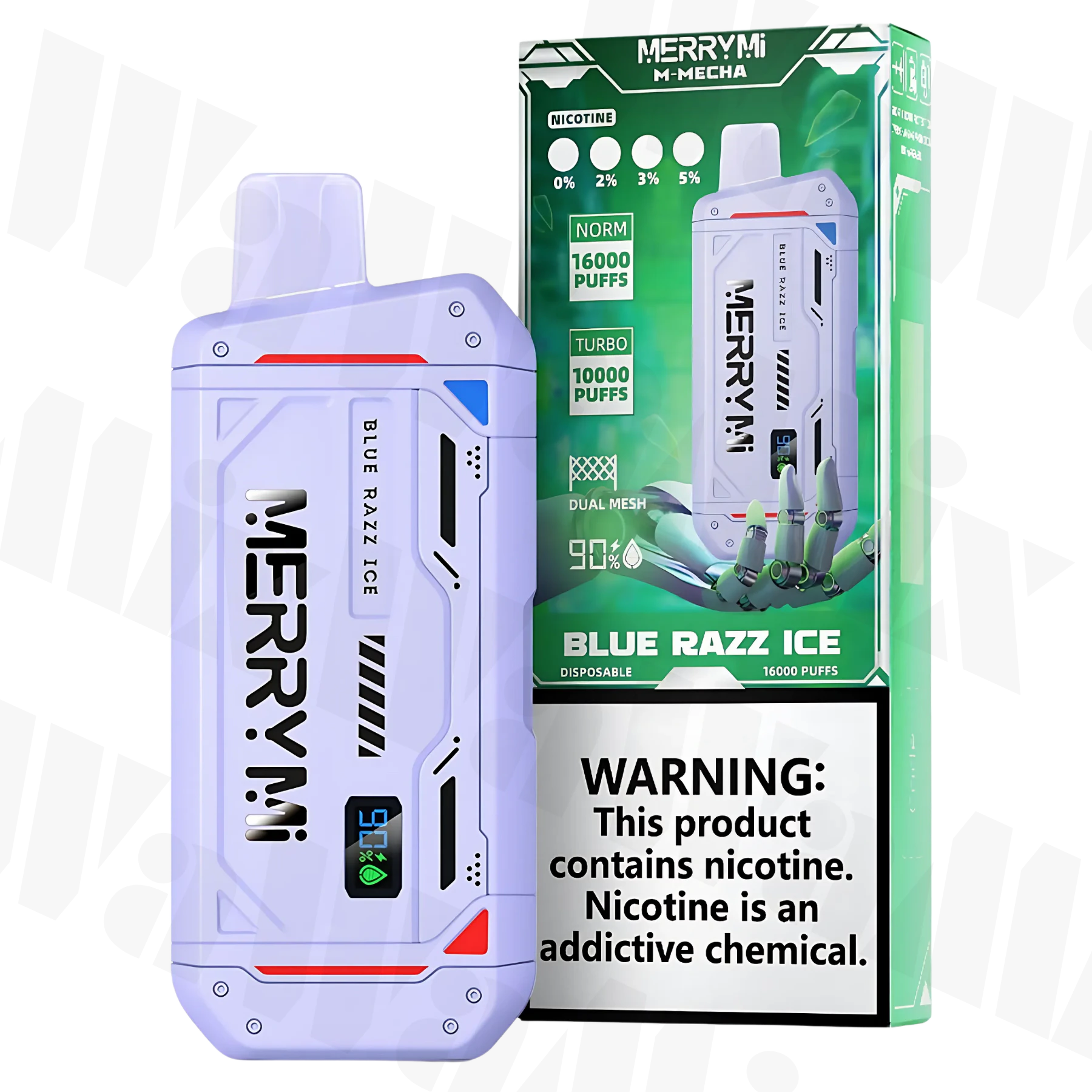 M-Mecha is an innovative disposable e-cigarette created with maximum comfort of use in mind. Thanks to the capacious battery 850 mAh and an impressive amount 20 ml e-liquid, the device offers up to 16.000 puffs, which makes it one of the most efficient models on the market. This is an ideal solution for people looking for a convenient and maintenance-free way to vape.